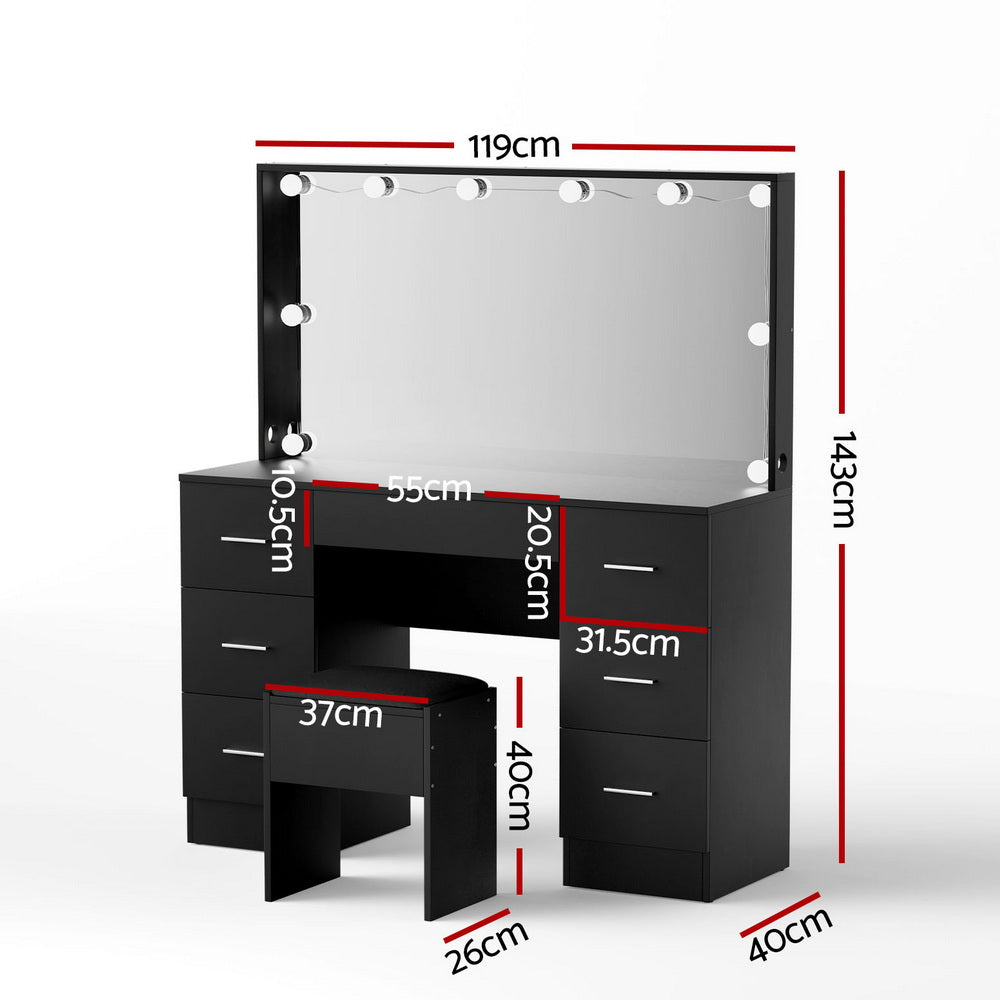 Complete your beauty space with the Glam Craft Vanity Station, featuring a luxurious black finish and a cushioned matching stool for ultimate comfort. The mirror is framed by 10 radiant LED bulbs, giving you bright, professional lighting every time you get ready. Together, the vanity and stool create a refined, elegant setup that transforms your daily routine into a truly glamorous moment.